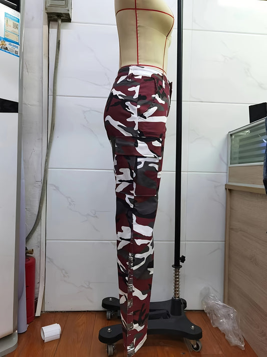 High Waist Straight Camouflage Cargo Jeans, Camo Print Medium Stretch Side Flap Pocket High Rise Denim Pants, Women's Denim Jeans & Clothing