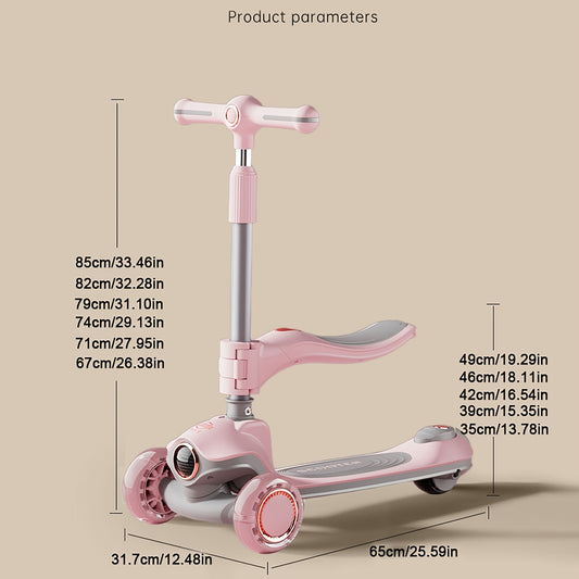 Kids Scooter with Foldable Seat & 2-in-1 Sit & Stand Modes, 5-Level Adjustable Handlebar, Pink with LED Lights & Music, 2-Wheel Stability, Front Brakes & Rear Suspension, Heavy-Duty Construction for Boys & Girls 3-12 Years (B