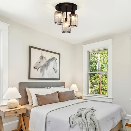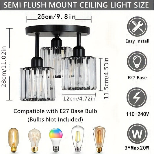 Modern 3-Light Semi-Flush Mount Crystal Chandelier - Metal Ceiling Light Fixture with Glass Shades for Dining Room, Foyer, Hallway, Kitchen Island, Office - E27 Bulb Base, Hardwired (Bulbs Not Included)