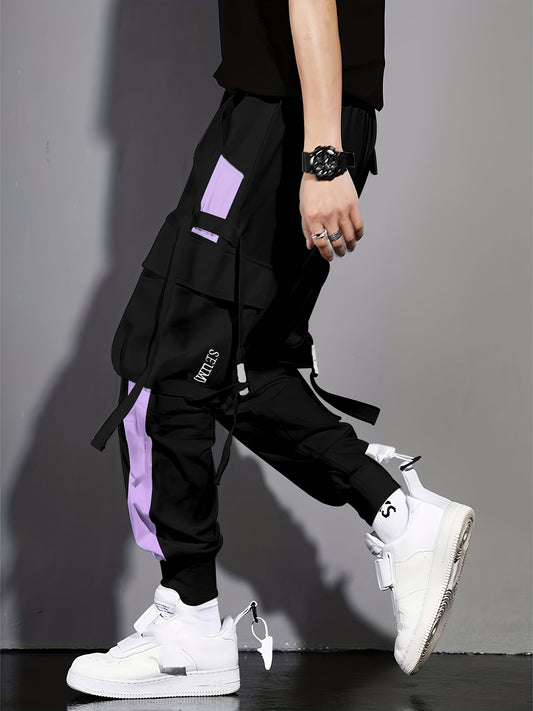 Multi-pocket Ribbon Design, Men's Color Block Cargo, Trendy Comfy Jogger Pants