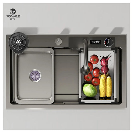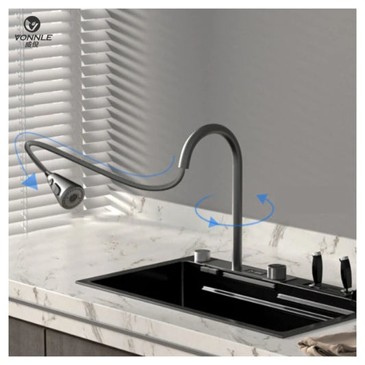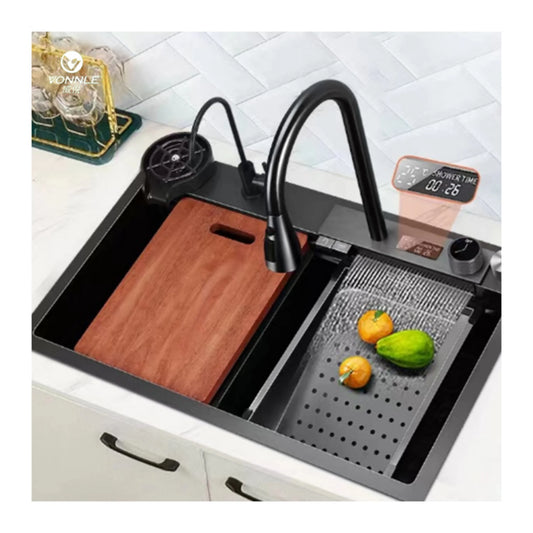 Newly Designed Stainless Steel Digital Display Waterfall Faucet Single Bowl One-Hole Multifunctional Kitchen Features Black