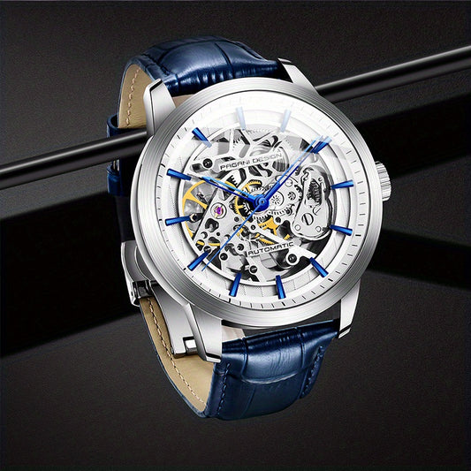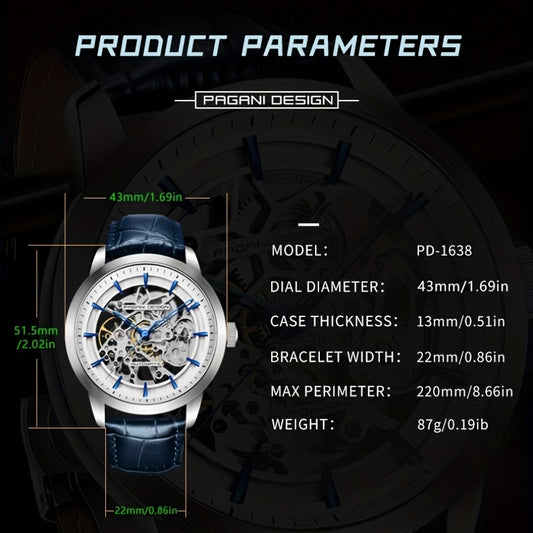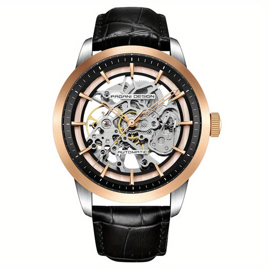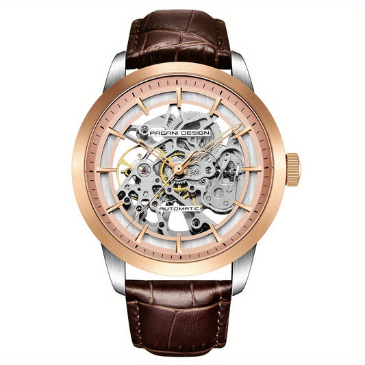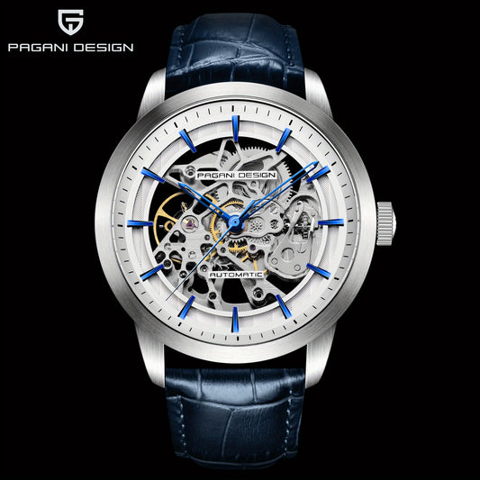 Pagani Design 2023 Men's Automatic Skeleton Watch, Self-Winding, Stainless Steel, Leather Strap, Pointer Series, Water Resistant To 100 Meters Sports Leather Watch