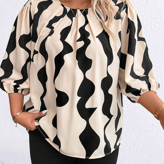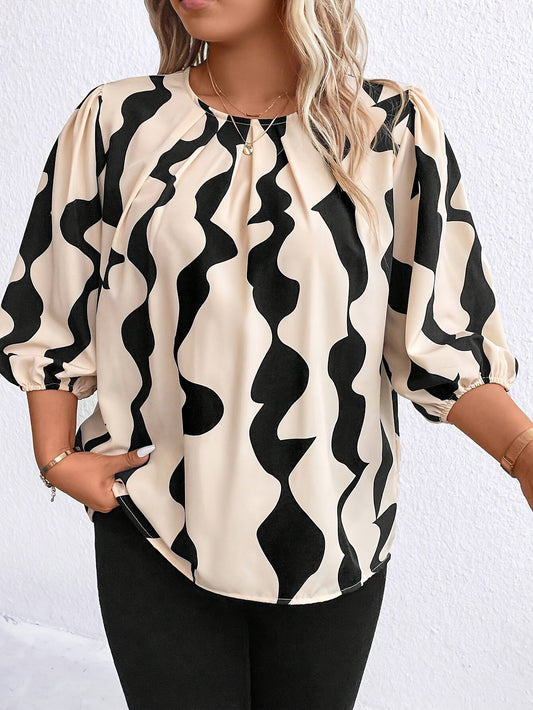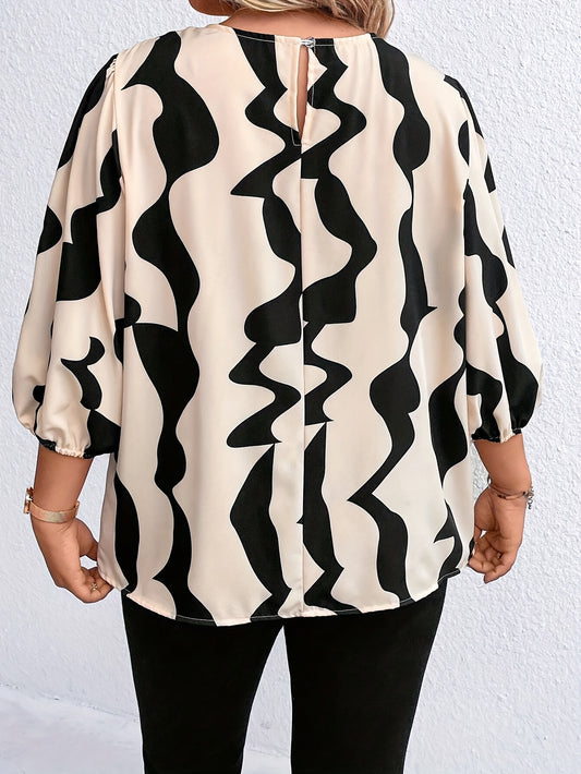 Plus Size Geometric Print Blouse, Casual Crew Neck Lantern Sleeve Blouse For Summer, Women's Plus Size Clothing