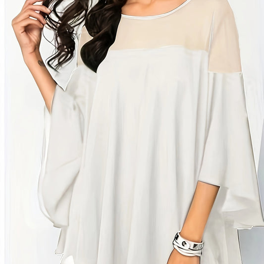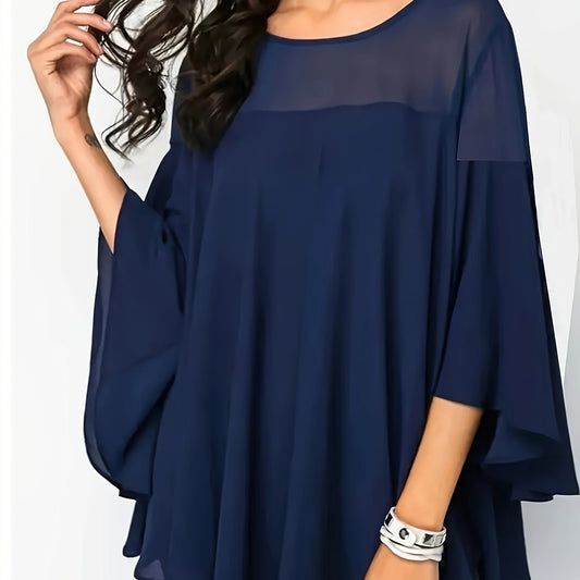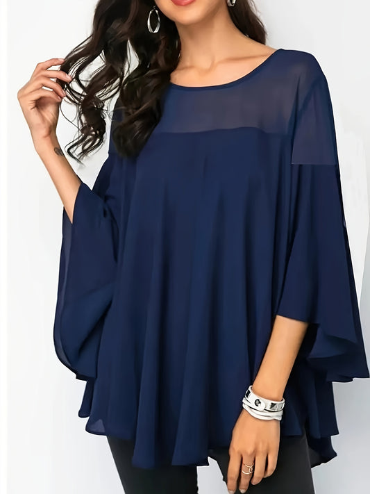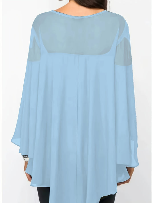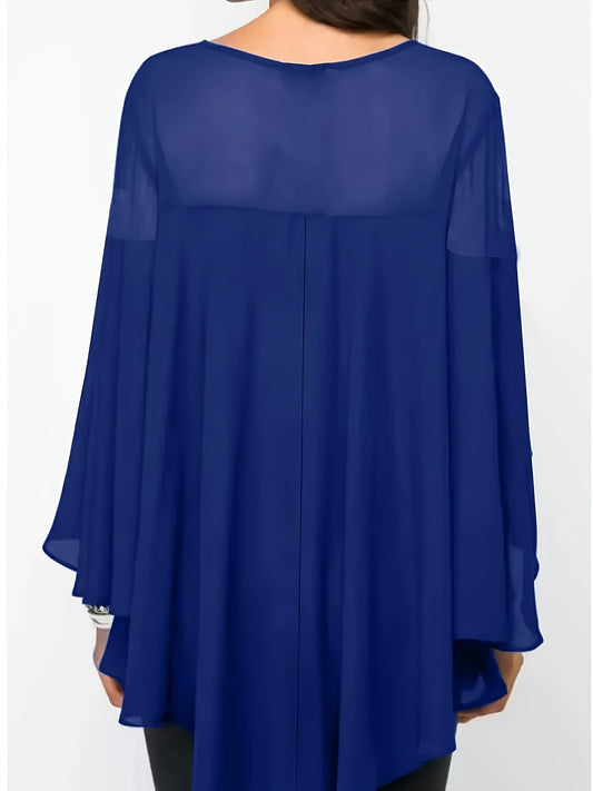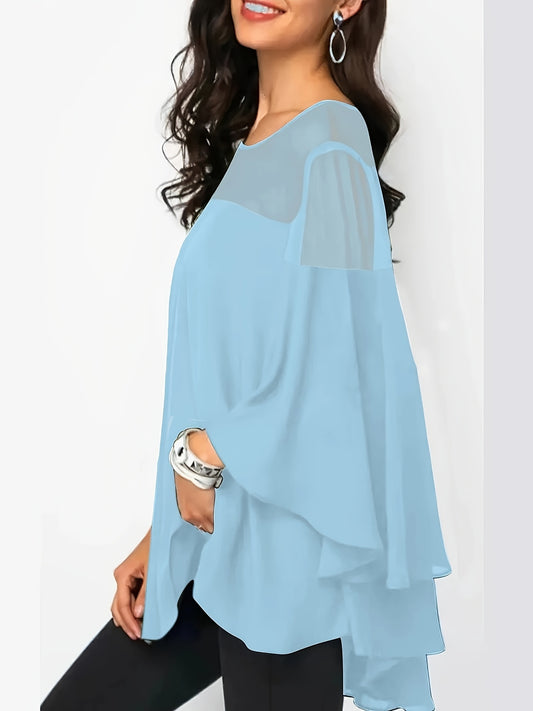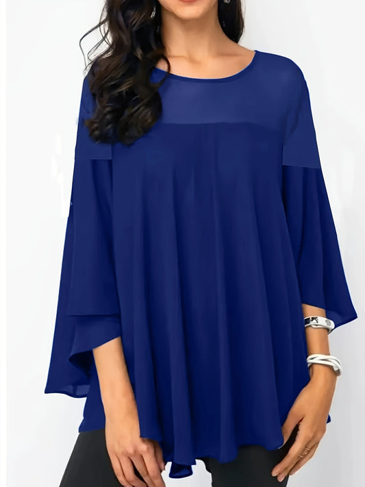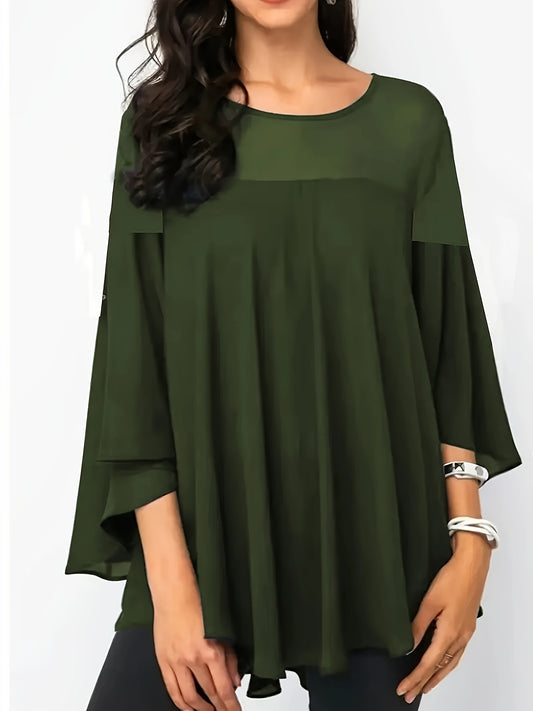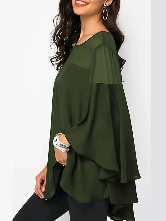 Plus Size Asymmetrical Hem Blouse, Casual Solid Crew Neck Blouse For Spring, Women's Plus Size Clothing