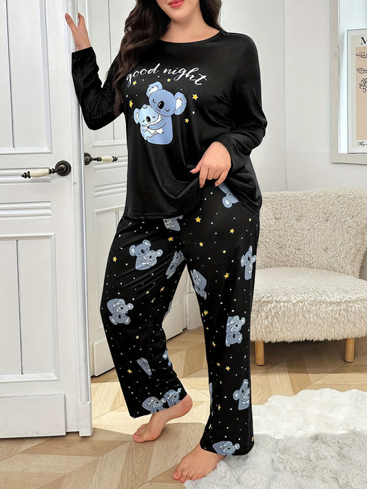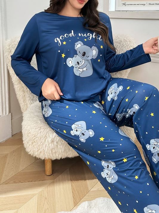 Plus Size Women's Fashion Casual Comfortable Wearable Loungewear Set with Cute Cartoon Koala Print Long Sleeve Top & Full-Print Pants 2pcs Pajama Set