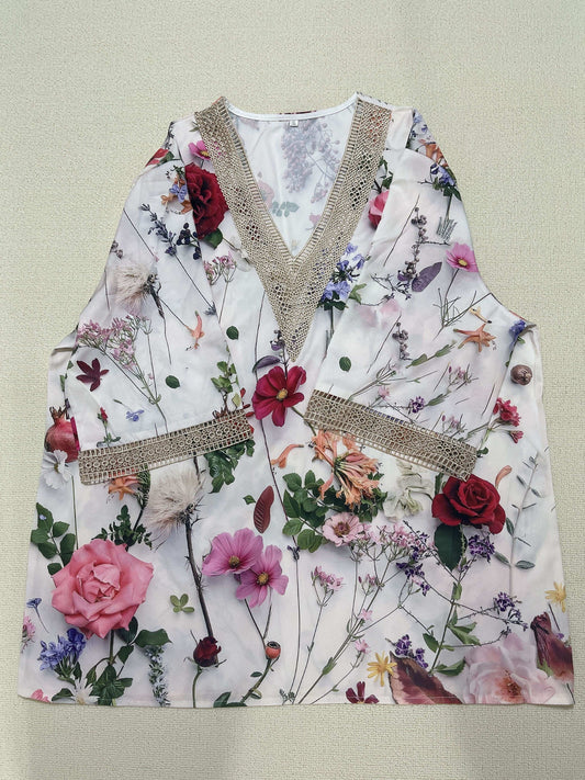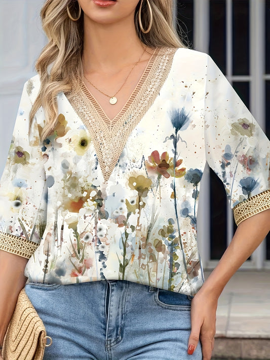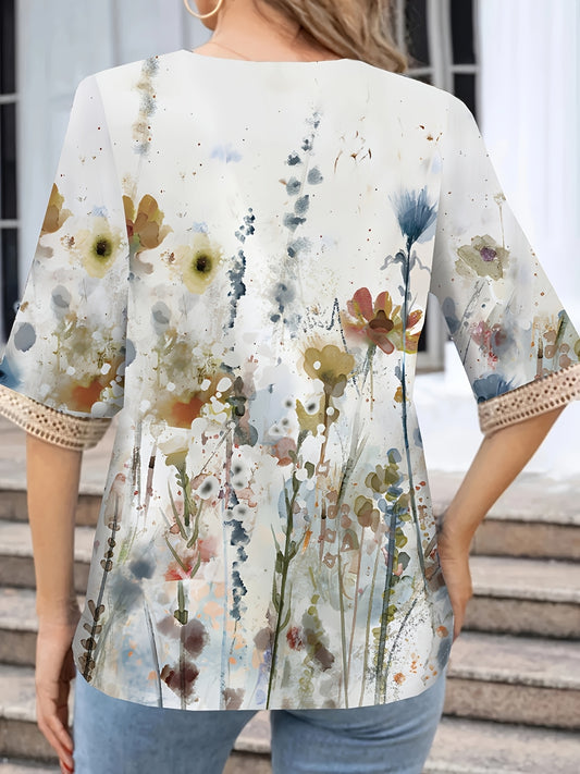 Plus Size Casual T-shirt, Women's Plus Floral Print Contrast Lace Half Sleeve V Neck T-shirt