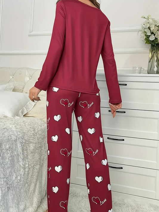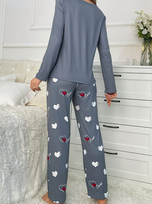 Plus Size Casual Heart Print Round Neck Long Sleeve Pantsuit