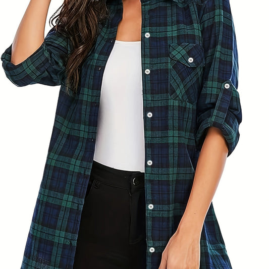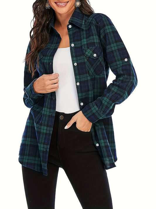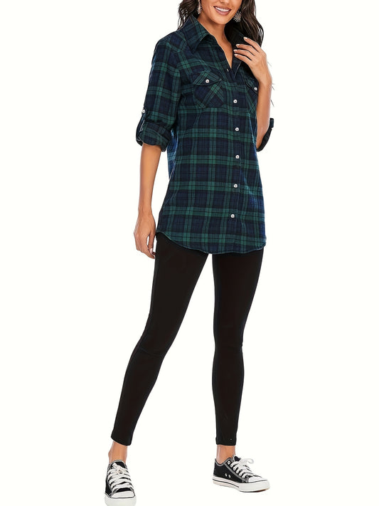 Plus Size Casual Top, Women's Plus Plaid Print Button Up Long Sleeve Turn Down Collar Blouse