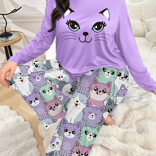Plus Size - Plus Size Women'S Cozy Long Sleeve Pajama Set with Adorable Print - Soft Purple &, All-Season Comfort, Casual Home Wear, Perfect for Fall & Winter