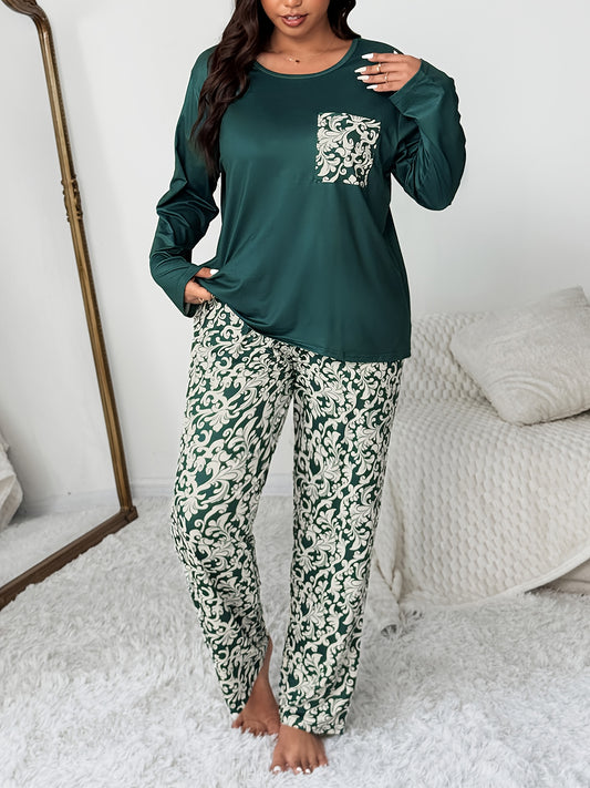 Plus Size Pocket Round Neck Long Sleeve Top and Geometric Floral Print Pants 2pcs Comfortable Casual Pajama Set