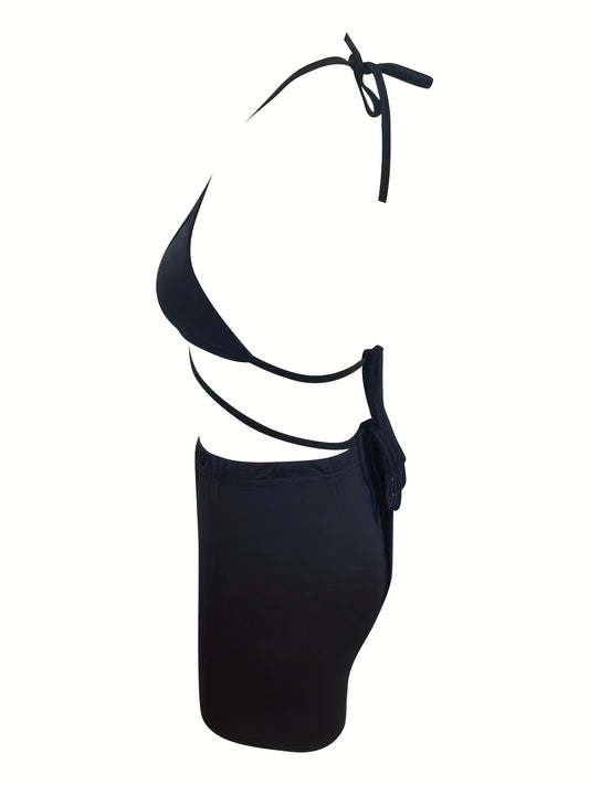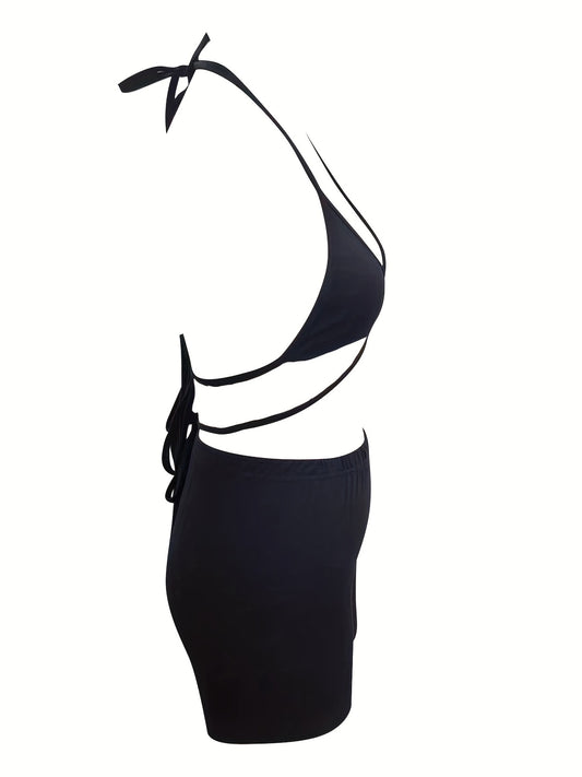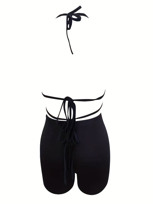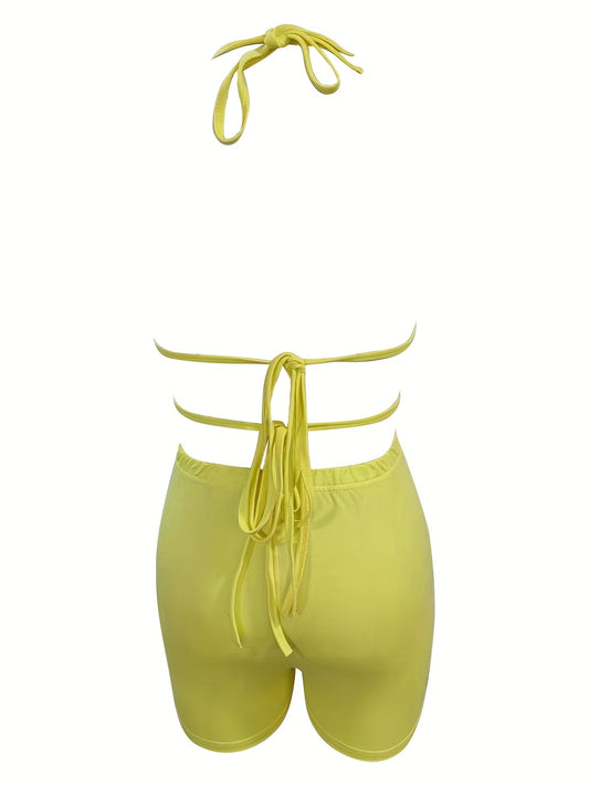 Sexy Solid Two-piece Set, Halter Neck Crop Top & Elastic Waist Shorts Outfits, Women's Clothing