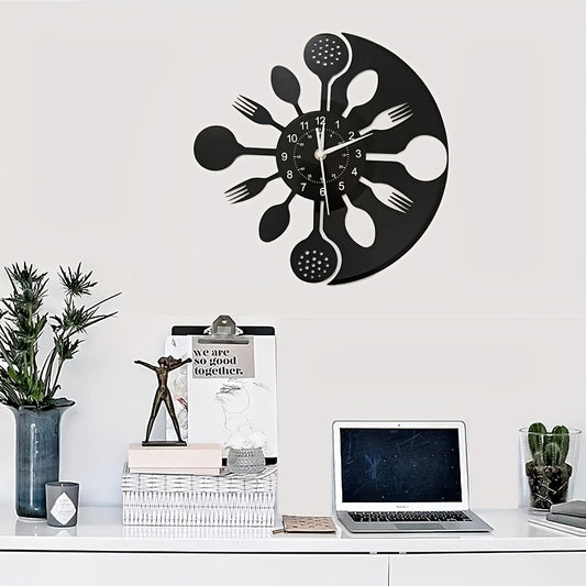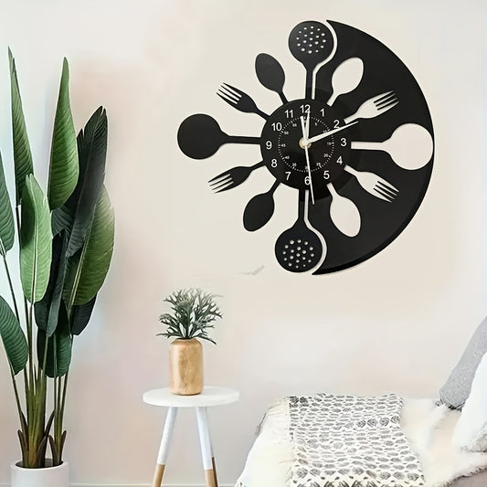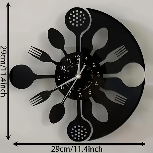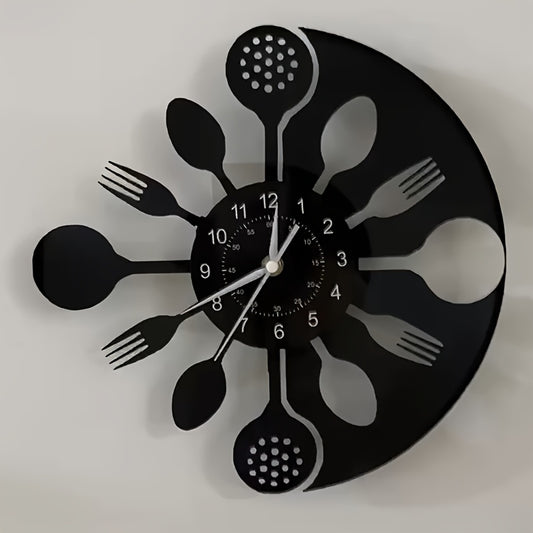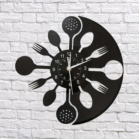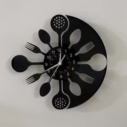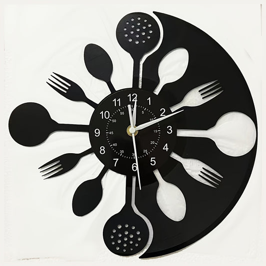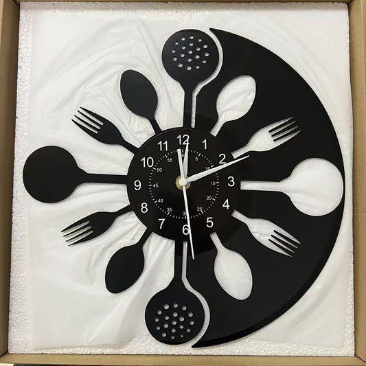 Silent Mechanical Vinyl Record Wall Clock - Vintage Kitchen Utensil Design with Fork & Spoon Hands, Black & White Home Decor for Living Room, Bedroom, Kitchen - Unique Gift for Christmas, Birthday, New Year, Creative Numeral