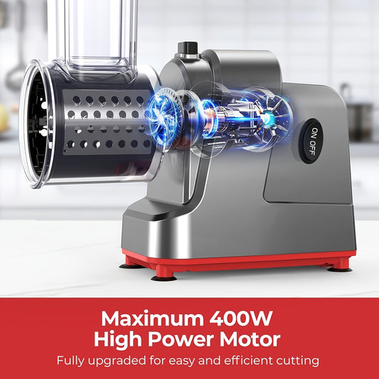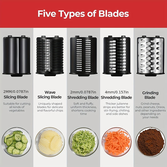 SENBOWE 5-in-1 Electric Cheese Grater & Salad Maker - Versatile Kitchen Gadget with 5 Blades for Perfect Slices, Shreds & Chops - Ideal for Cheese, Vegetables, Nuts & More - Stainless Steel, EU Plug