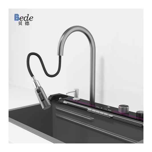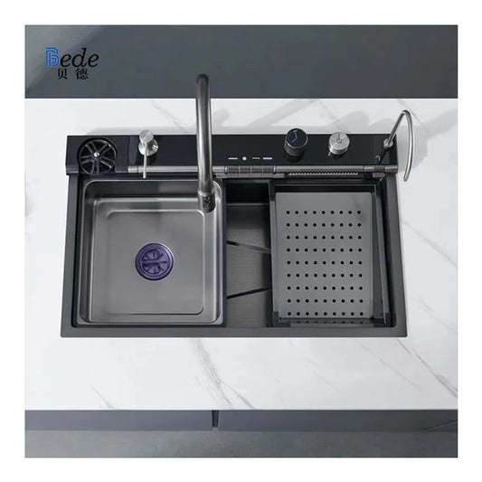Single Modern Stainless Steel 304 LED Digital Waterfall Kitchen Sink New Design Popular Black Smart Multifunctional Handmade One