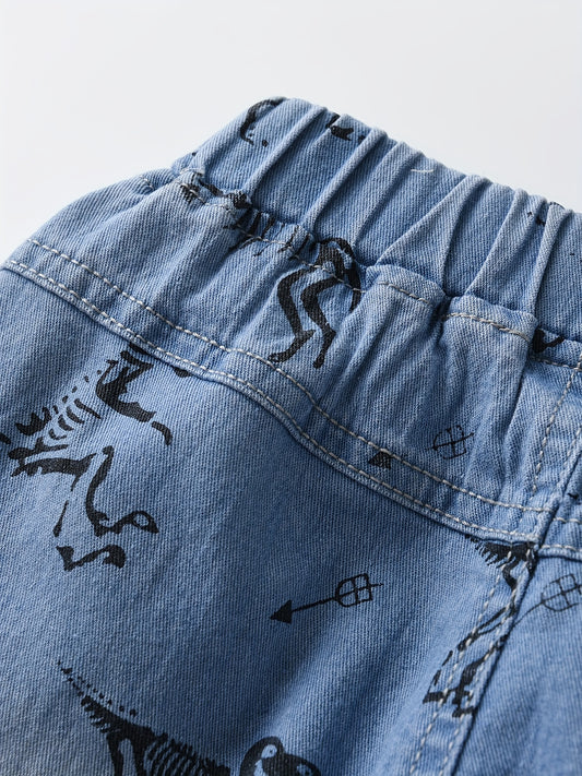 Skeleton Dinosaur Print Boys Comfortable Creative Denim Shorts, Casual Slightly Stretch Shorts For Summer Outdoor
