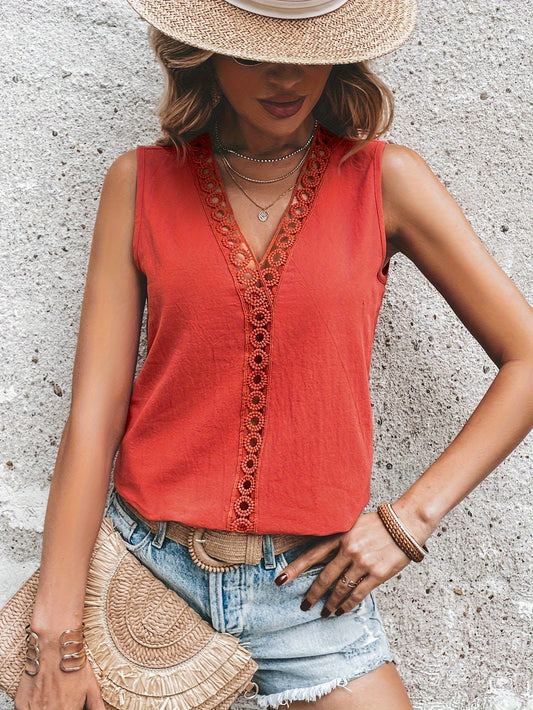 Solid Color Lace Trim V-neck Blouse, Vintage Sleeveless Loose Blouse For Spring & Summer, Women's Clothing
