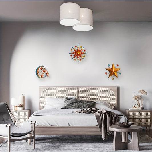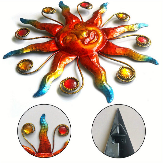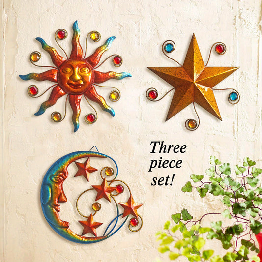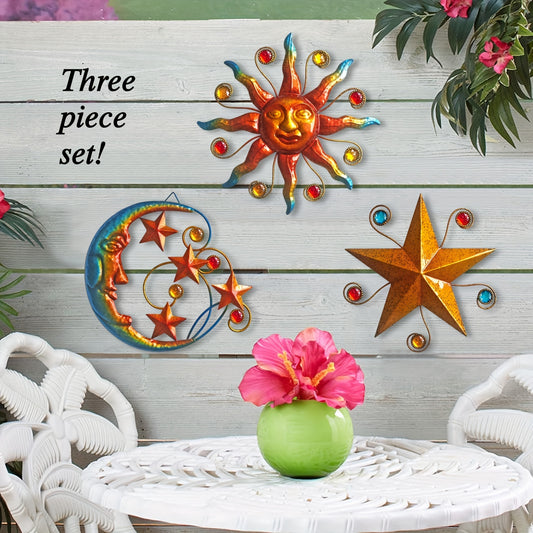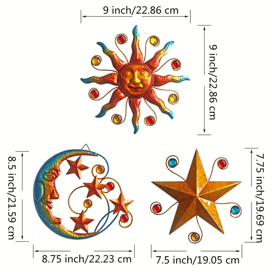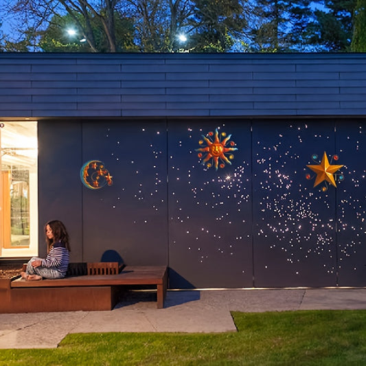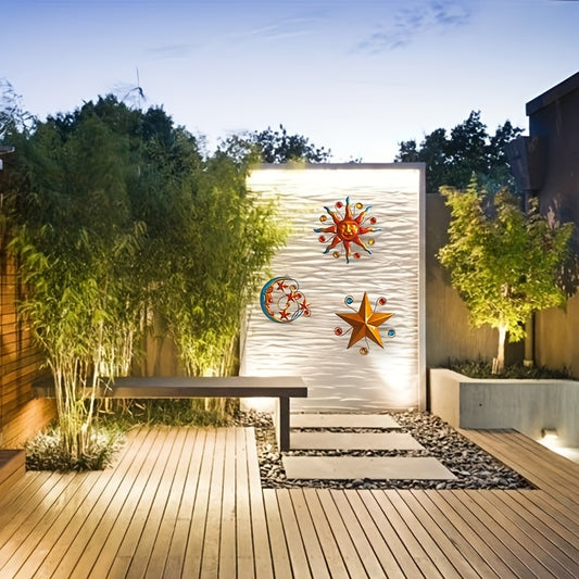 Solar-Powered Metal Outdoor Wall Art - Sun, Moon & Stars Decor with Colorful Gears & Jewels, Weather-Resistant Garden Ornament for Patio, Balcony, or Garden, Solar Outdoor Decor