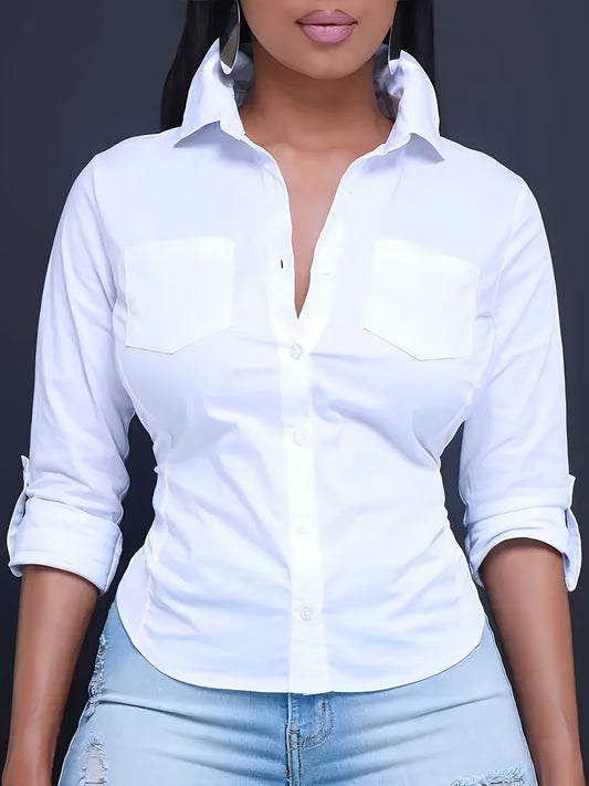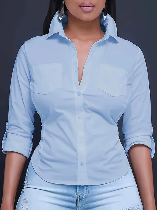 Solid Color Button Front Shirt, Casual Long Sleeve Pocket Shirt For Spring & Fall, Women's Clothing