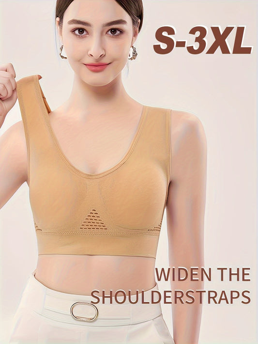 Solid Color Breathable Sports Bra, Round Neck High Stretch Hollow Out Fitness Top, Women's Activewear