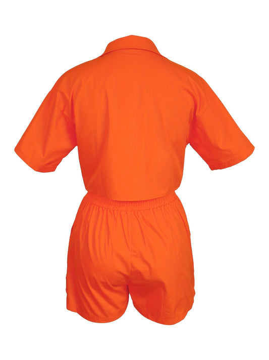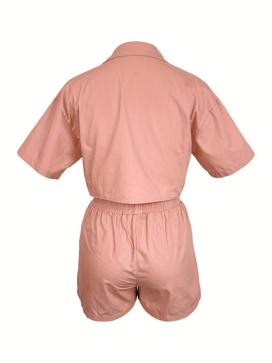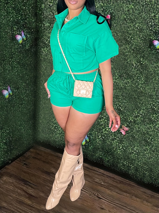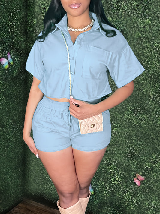 Solid Casual Two-piece Set, Short Sleeve Button Crop Top & Drawstring Waist Shorts Outfits, Women's Clothing