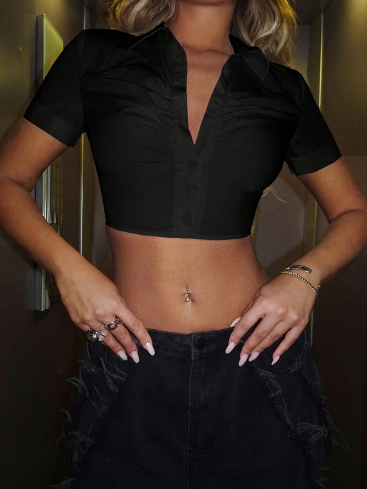 Solid Button Front Crop Shirt, Versatile Short Sleeve Ruched Blouse For Spring & Summer, Women's Clothing