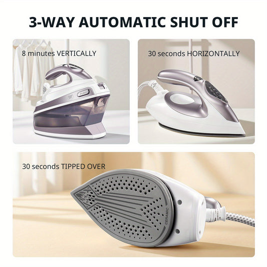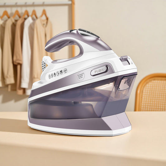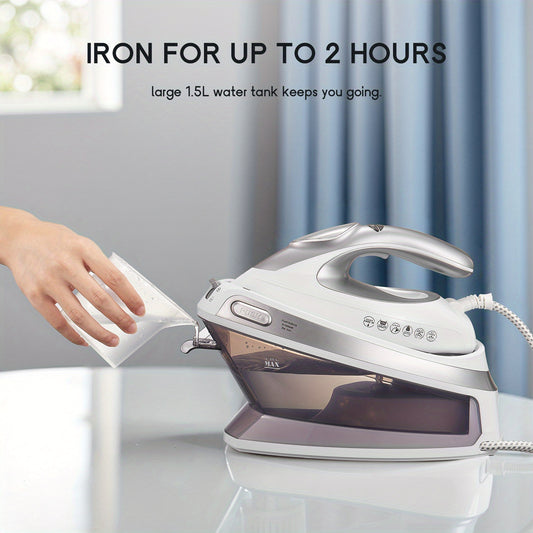Steam Station Iron Offers 5.5 Bar Pressure, a 1.5L Water Tank, Ceramic Soleplate, Anti-Limescale Function, Vertical Steaming, Three Temperature Settings, Cord Storage, And 2400W Power. Available in Light Purple.