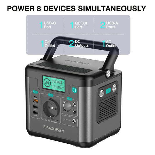 SWAREY Portable Power Bank, Power Station 518 Wh, Solar Generator 500 W AC Output, 65 W USB-C Port, Power Generator Battery for Party, Travel, Camping, Motorhome, Emergency