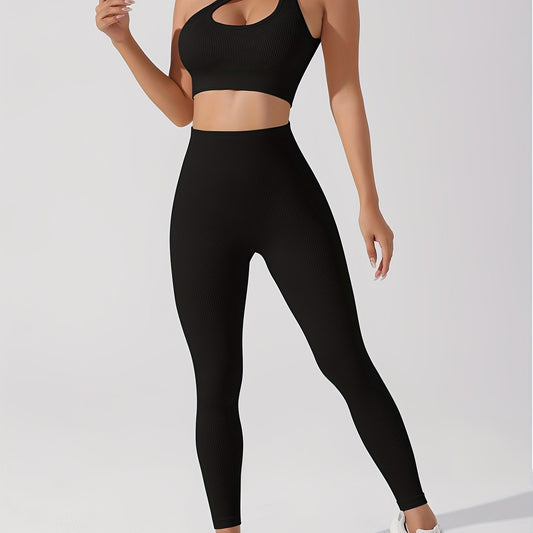 Women's 2-Piece Yoga Set, Cross-Back Sports Bra And High-Waisted Leggings, Seamless Knit Activewear For Gym And Fitness, Solid Color