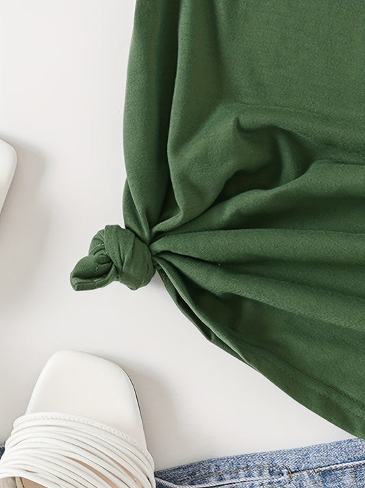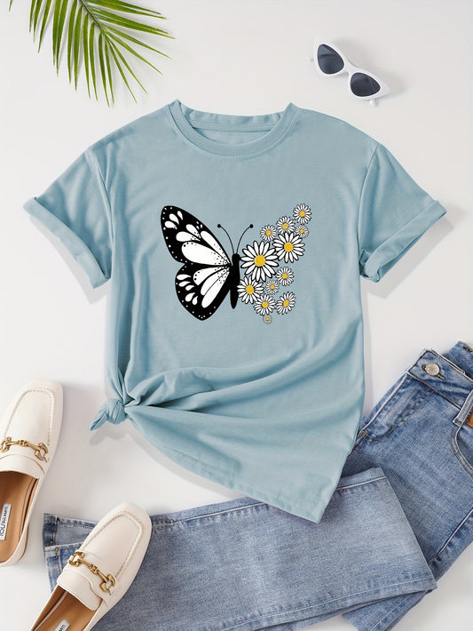 Women's Casual Butterfly & Daisy Floral Print Round Neck T-Shirt - Olive Green, Machine Washable, Regular Fit for Casual Attire, Allseason Fashion, Relaxed Style, Nontransparent Fabric