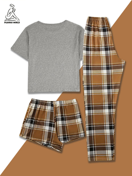 Women'S Casual Cartoon Bear & Plaid Pajama Set - Soft, Loose-Fit Short Sleeve Top with Elastic Waistband, Long Pants & Shorts, Cozy Fall/Winter Sleepwear