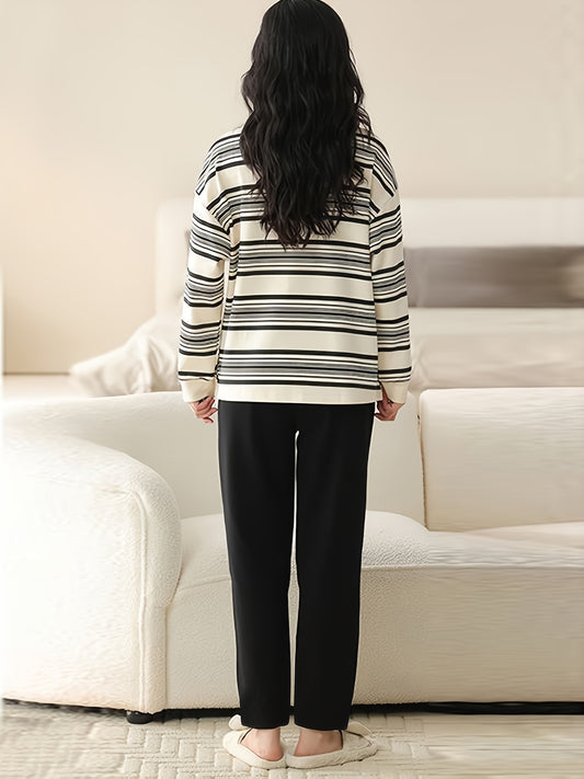 Women's Black and White Striped Cat Print Casual Pajama Set - Elastic Waist Pants with Round Neck Long Sleeve Top, Machine Washable, Perfect Seasonal Sleepwear, Loose Fit | Whimsical Pattern T-Shirt | Polyester Blend Fabric,