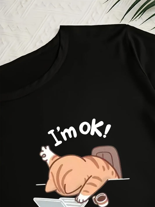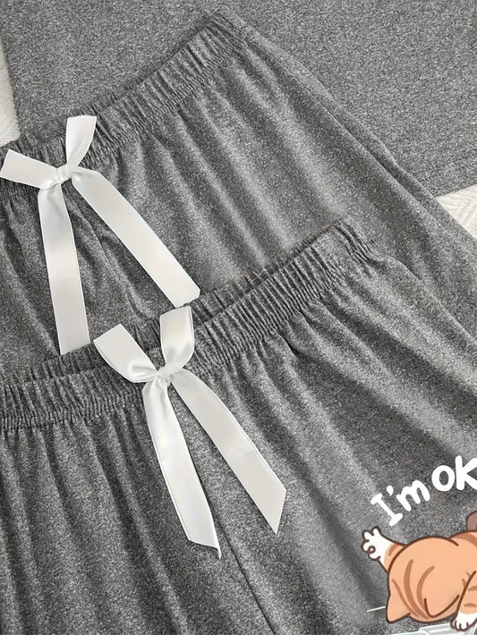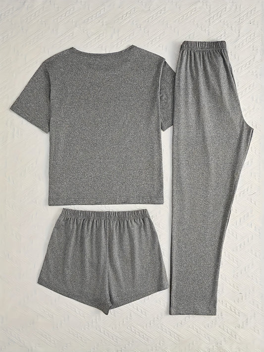 Women's 3pcs Pajama Set, Cartoon Work Kitten Print Short Sleeve Pajamas, Shorts and Longs - Bow Style, Suitable for Multiple Seasons