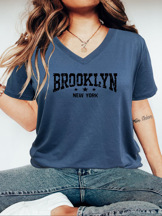 Women's Casual V-Neck T-Shirt with Brooklyn New York Letter Print - Vibrant Pink & Black Graphic, Short Sleeve Regular Fit, Machine Washable for Spring Summer Fall, Ladies T Shirts, Casual Attire, Durable Fabric