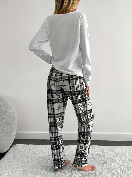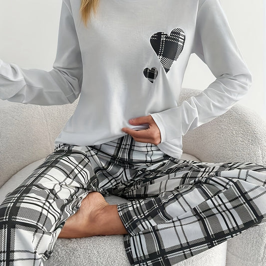 Women'S Cozy Plaid Pajama Set with Heart Print - Long Sleeve Crew Neck Top & Matching Pants, Soft & Comfortable for Fall/Winter, Casual Sleepwear, Casual Sleepwear|Plaid Pattern|Soft Fabric