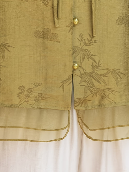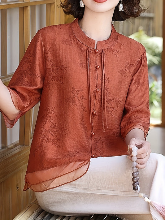 Women'S Elegant Summer Blouse with Floral Pattern - Short Sleeve, Mandarin Collar, Loose Fit, Light Olive Green, Perfect for Casual Attire, Casual Attire Blouse | Floral Pattern Top | Mandarin Collar Shirt