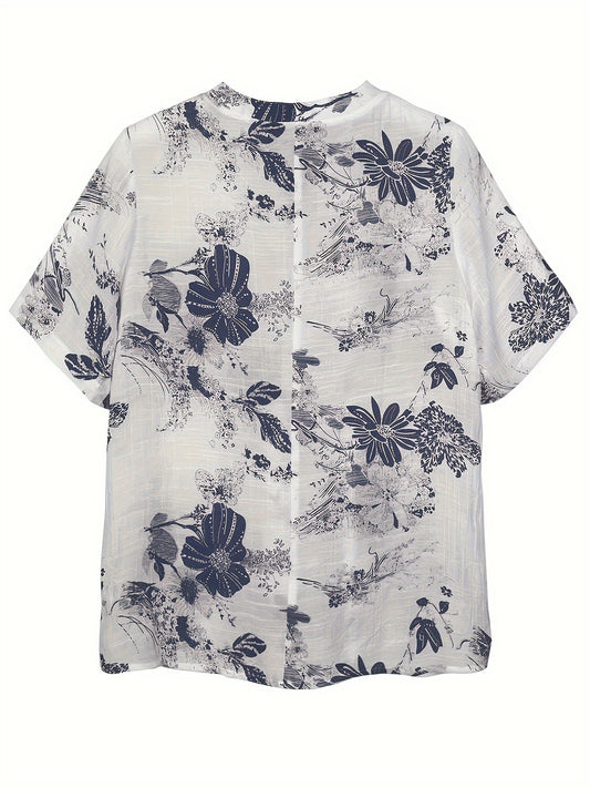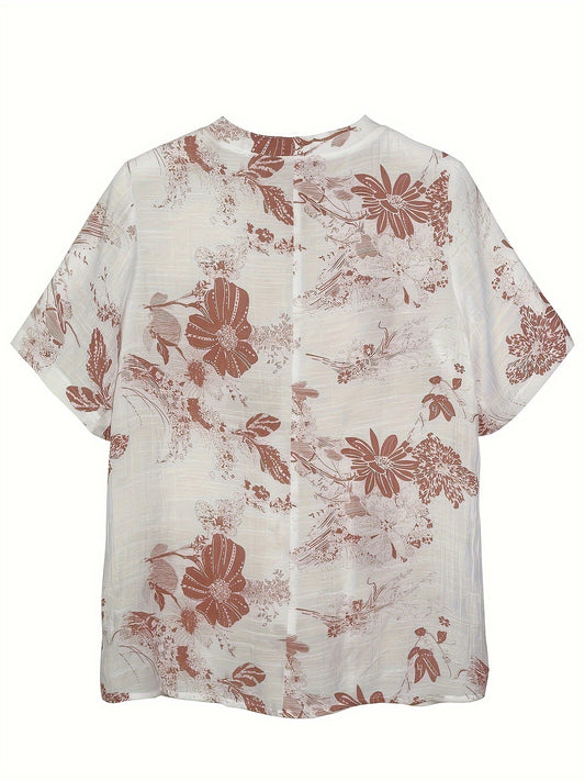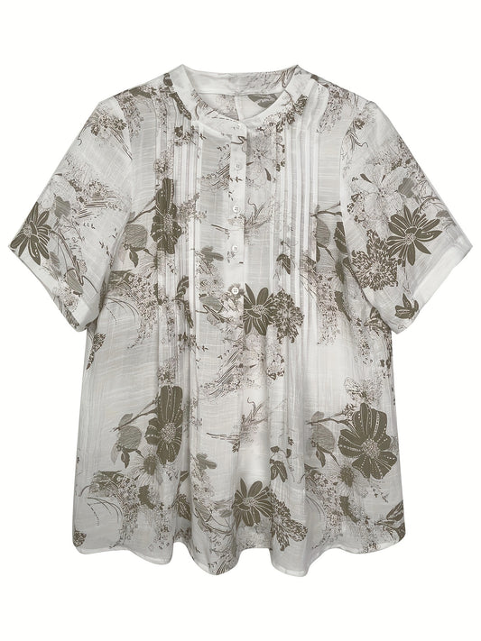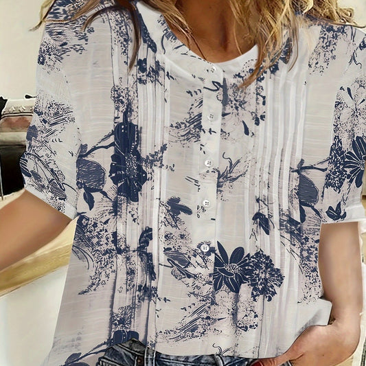 Women's Floral Print A-Line Blouse - Casual Short Sleeve, Round Neck with Front Button Detail, Lightweight Polyester Blend, Perfect for Spring/Summer