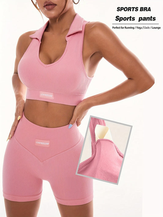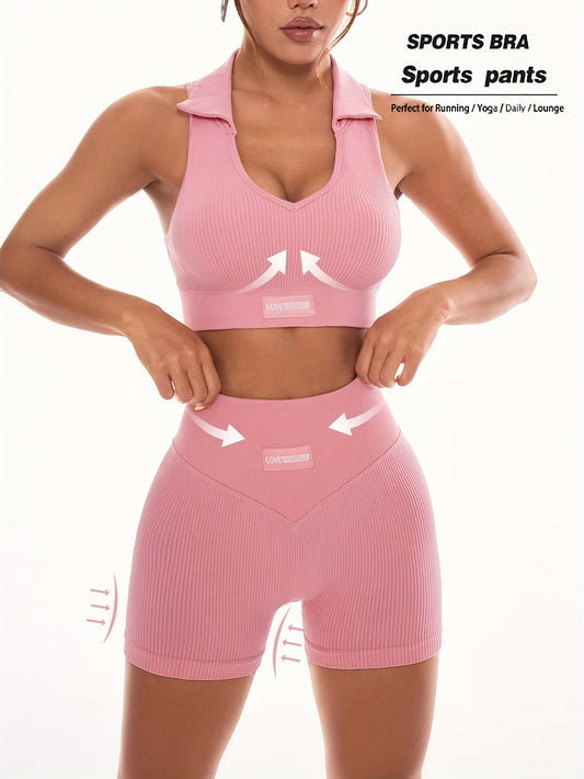 Women'S High Stretch Ribbed Fitness Set, Pink Sleeveless Sports Bra and Shorts with Removable Pads, Ideal for Running and Outdoor Activities