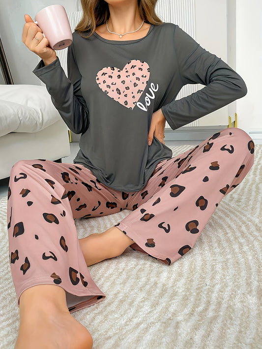 Women'S Heart & Leopard Print Pajama Set - Cozy Long Sleeve Top & Elastic Waist Pants, Soft, Casual Home Wear, All-Season Comfort, Casual Loungewear|Playful Print Top| Fabric, Plu Size Pj For Women, Plu Size Women Pj, Pj Wome
