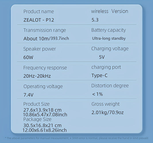 ZEALOT 60W Subwoofer Speaker, Wireless Speaker with Handle, 8000mAh Battery, Easy to Carry, RGB Lights, EQ Mode, TWS Pairing, Booming Bass. IPX5 High Quality, Great for Parties And Gatherings. for Home, Car, Camping-ZEALOT P1