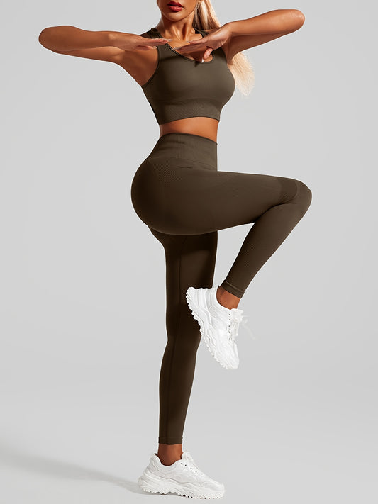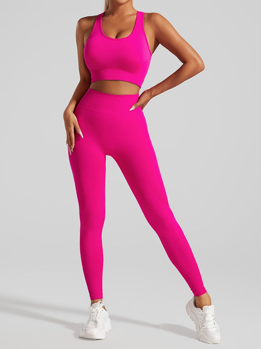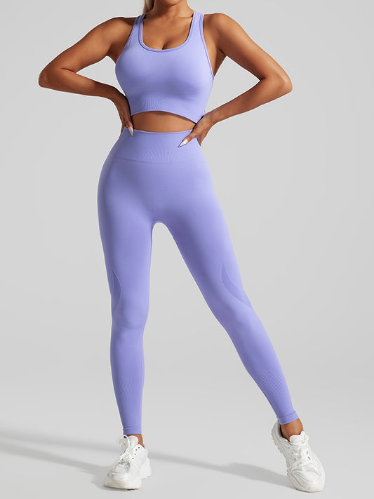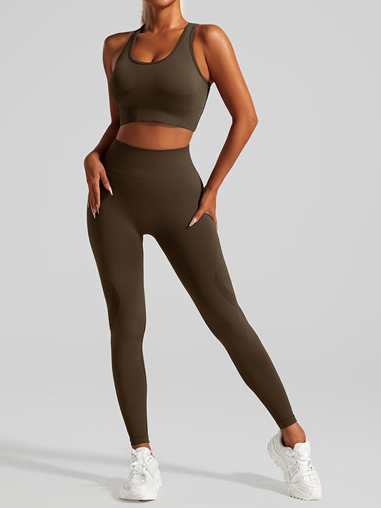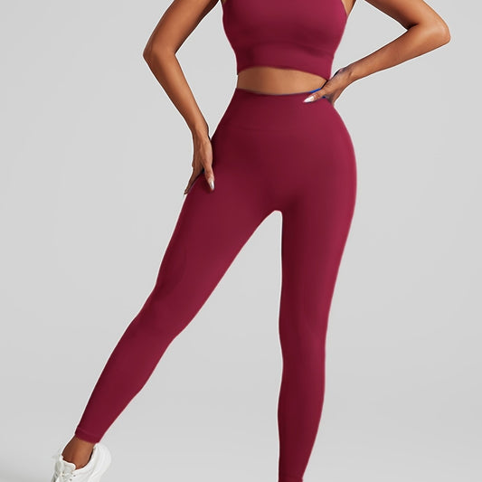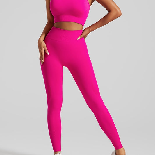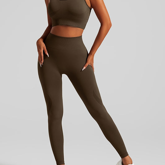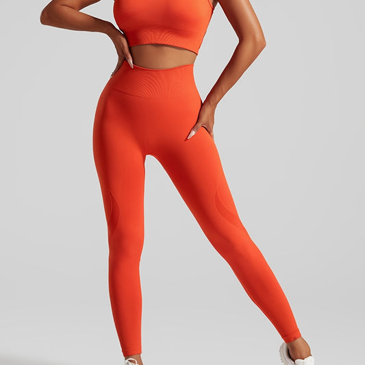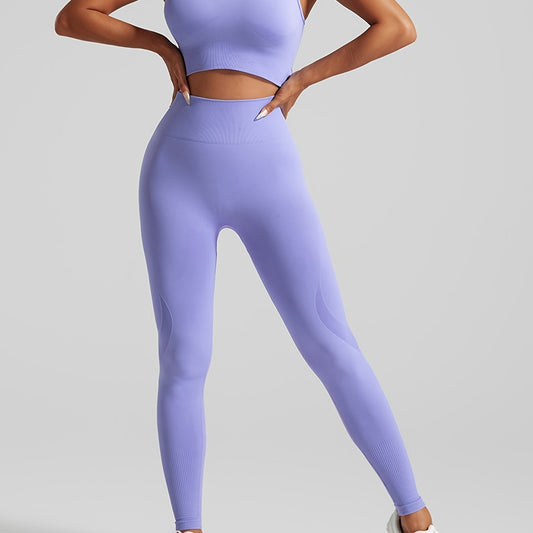 [2pcs Women'S Sports Activewear Set] 2pcs Women'S Sports Activewear Set, High Waist Seamless Yoga Pants with Supportive Sports Bra, Nylon Knit Fabric, Stretchy, Solid Color, All Seasons, Regular Fit