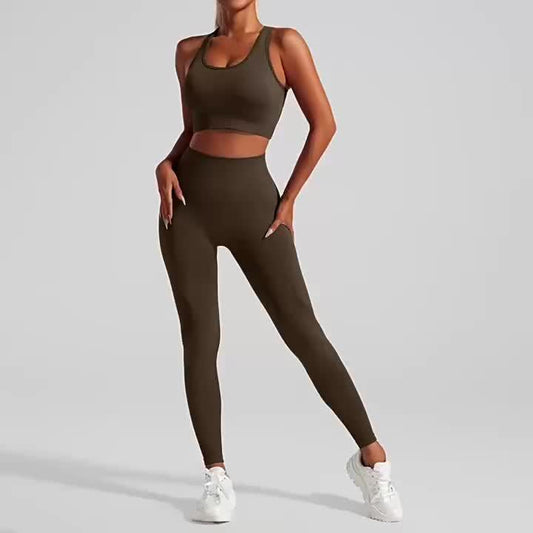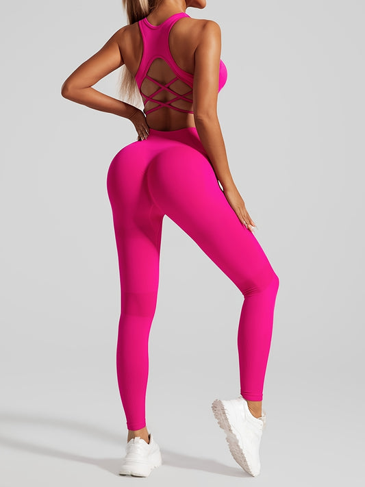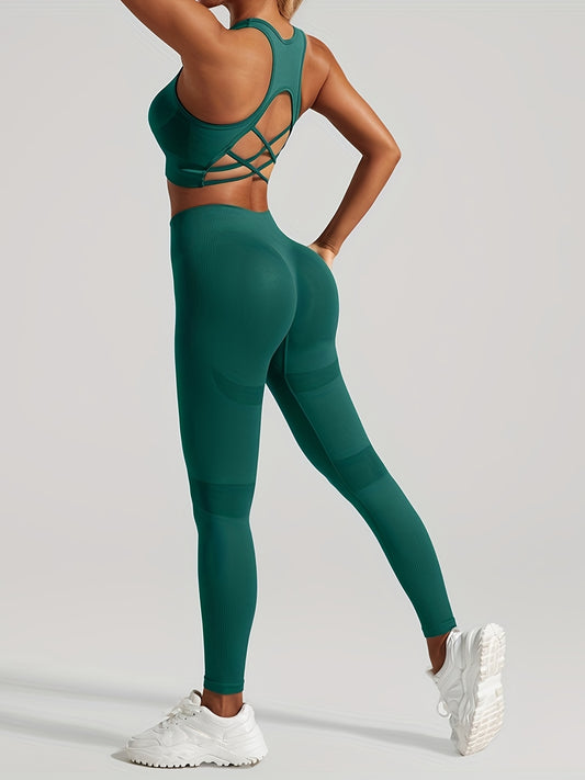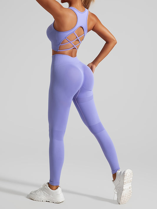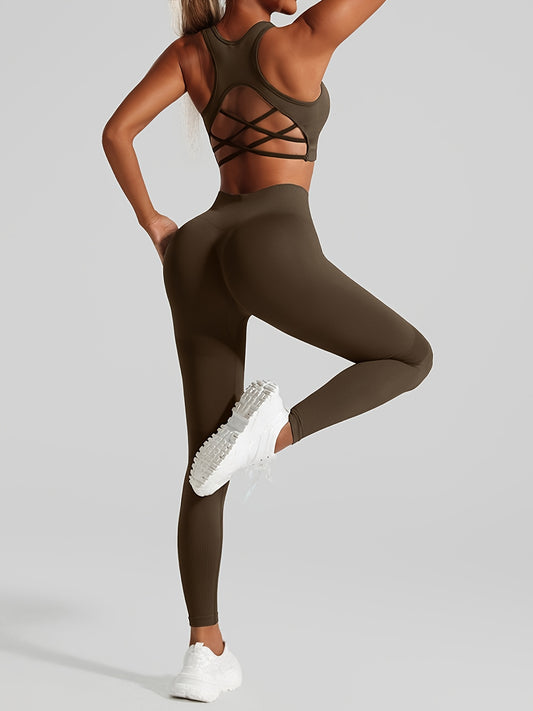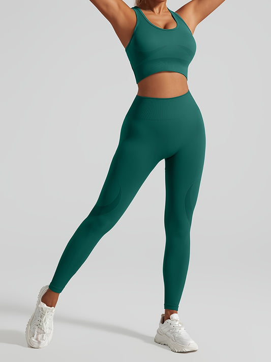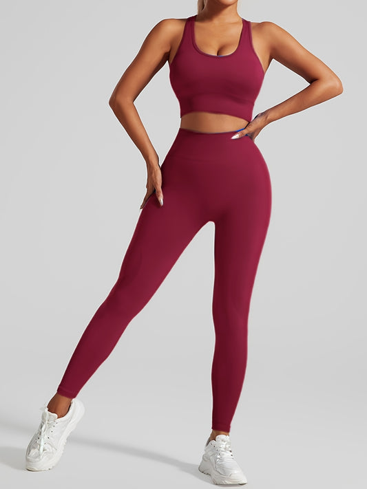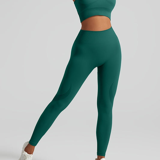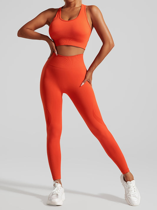 [2pcs Women'S Sports Activewear Set] 2pcs Women'S Sports Activewear Set, High Waist Seamless Yoga Pants with Supportive Sports Bra, Nylon Knit Fabric, Stretchy, Solid Color, All Seasons, Regular Fit