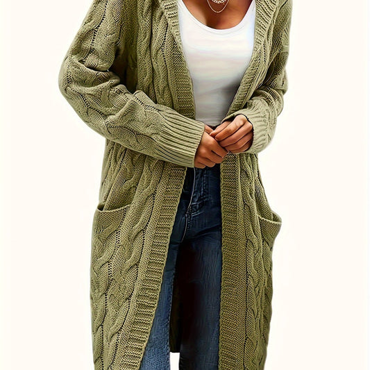 Women's Mid-Length Hooded Cardigan - Soft Stretchy Solid Color Long Sleeve Open Front Sweater with Pockets, Machine Washable Casual Elegance for Fall Winter, Everyday Comfort Wear, Stylish Hooded Design, Comfortable Fit