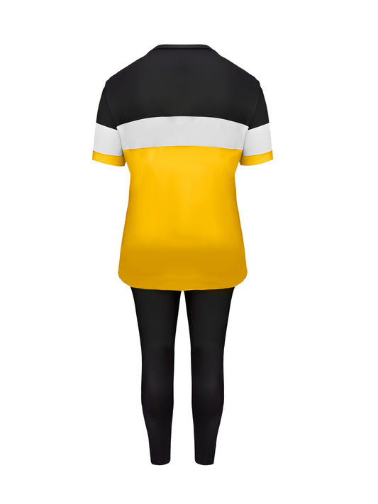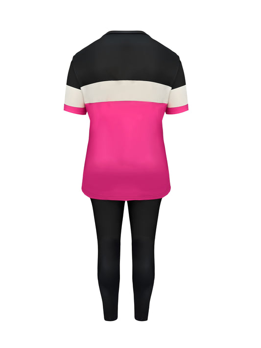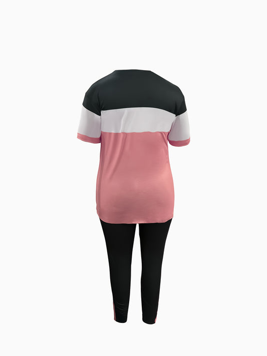 Women's Plus Size Two-Piece Set - Casual Color Block "Blessed" Graphic Tee & Pants with Pockets, Stretchy Polyester Blend, Machine Washable, Daily Comfort Outfit|Color Block Design|Elastane Comfort Stretch
