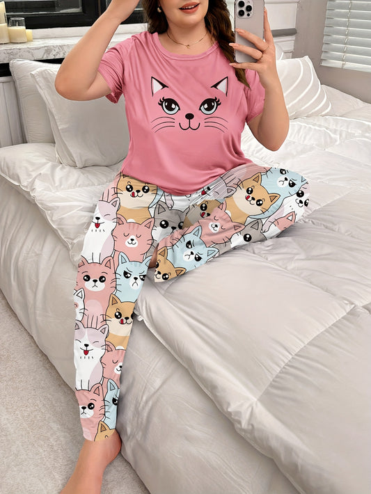 Women's Plus Size Cartoon Cute Cat Pajama Set