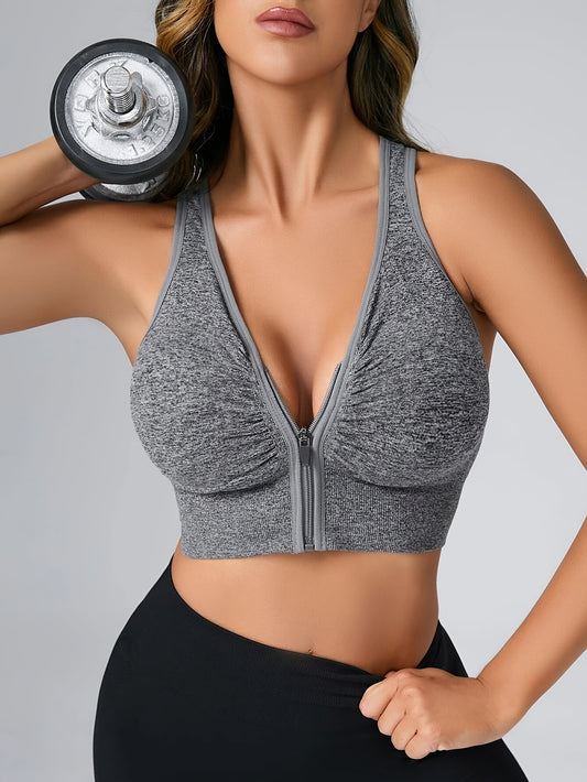 Women's Seamless Sports Bra With Zipper Front, Wide Shoulder Straps, Padded, Wire-Free, Comfort Fit, Racerback, Gym Fitness Yoga Bra Top