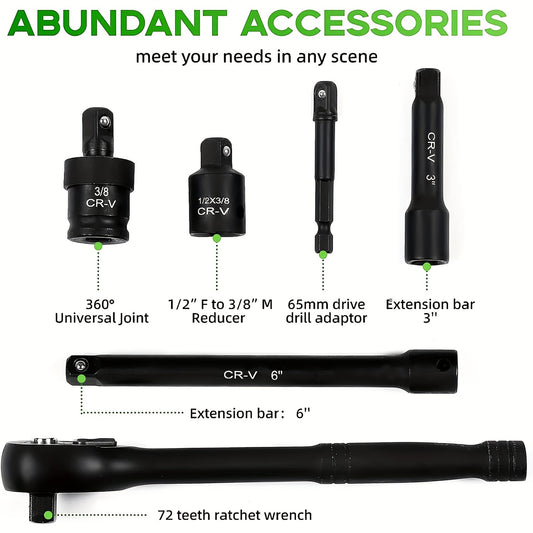 3/8" Drive Impact Socket Set, 6-Point 50pcs Standard Metric (8-22mm) & SAE (5/16-3/4-Inch) CR-V Steel Sockets with Adapters and Tape Handle, Nice Gifts