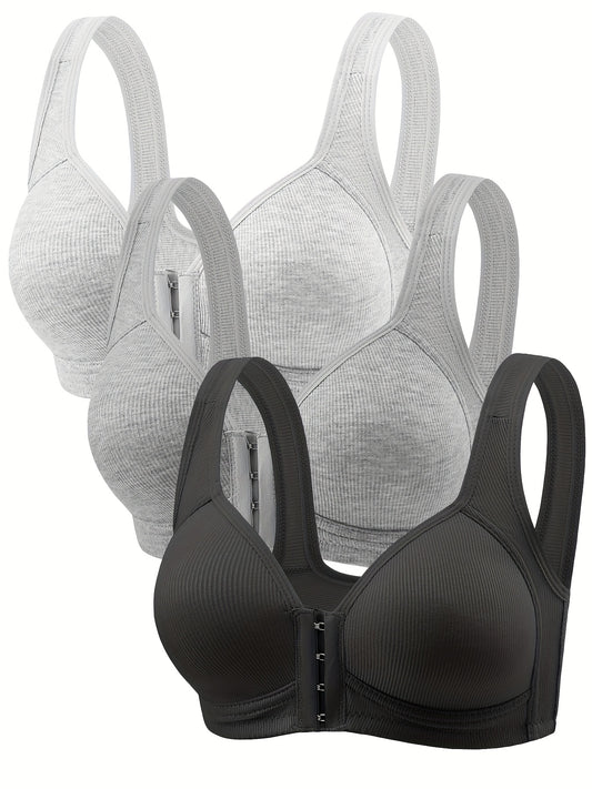 3-Piece Plus Size Front Zipper Bras - No Underwire & Removable Pads, Breathable Mesh Running Bras for Women, 1XL-5XL (Navy/Black/Purple), Casual Wear, Sleek Look, Comfortable Fit