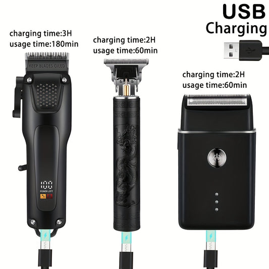 3pcs Professional Men's Hair and Beard Grooming Kit - Cordless Clippers with LED Display, Precision Trimmer Set, USB Rechargeable, for Home, Perfect Holiday Gift