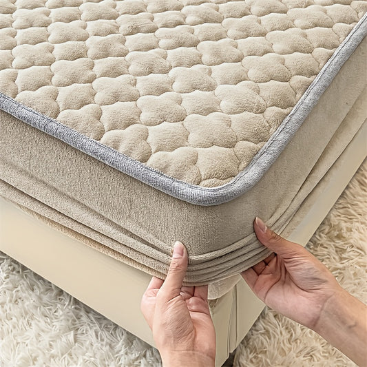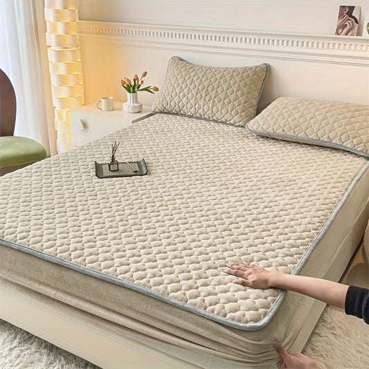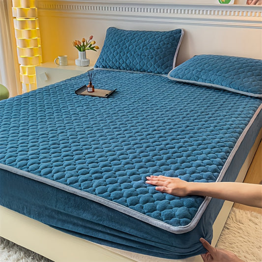 3pcs Soft And Comfortable Milk Velvet Fitted Sheet And Pillowcase Set, Sandwich Thickened Fitted Sheet And Pillowcase Set, Good Warmth Effect, Fitted Sheet Height 30Cm, Quilted Style Fitted Sheet, Suitable for Bedroom And Gue