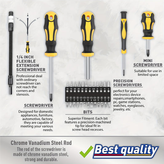 43pcs Professional Screwdriver Set with Magnetic Bit Holder - Chrome Vanadium Steel, Includes Slotted, Phillips, Hex, Torx Bits & Precision Tools - Durable Repair Kit for DIY & Industrial Use
